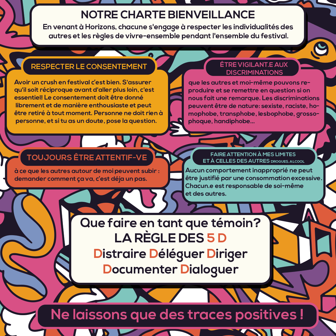 Consciente des bienfaits de la fête, comme de ses risques, l’association Horizons Productions s’engage pour proposer un événement où la sensibilité et la diversité de chacun.e sont respectées.