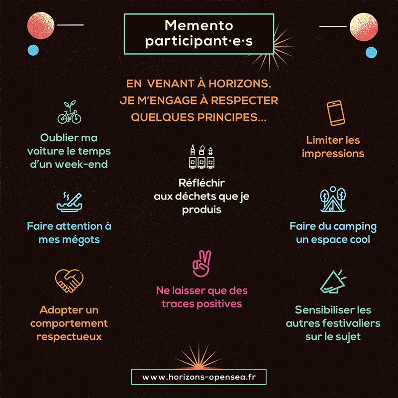 - Veillez à respectez le site et ses alentours. Depuis ses débuts Horizons s’engage à préserver les lieux occupés, que nous fréquentons au quotidien. Mais cet engagement repose aussi grandement sur vous, qui êtes parti prenante de l’événement. Alors sur les parkings, au camping, sur le site ou aux alentours, soyez respectueux et considérez les alentours.